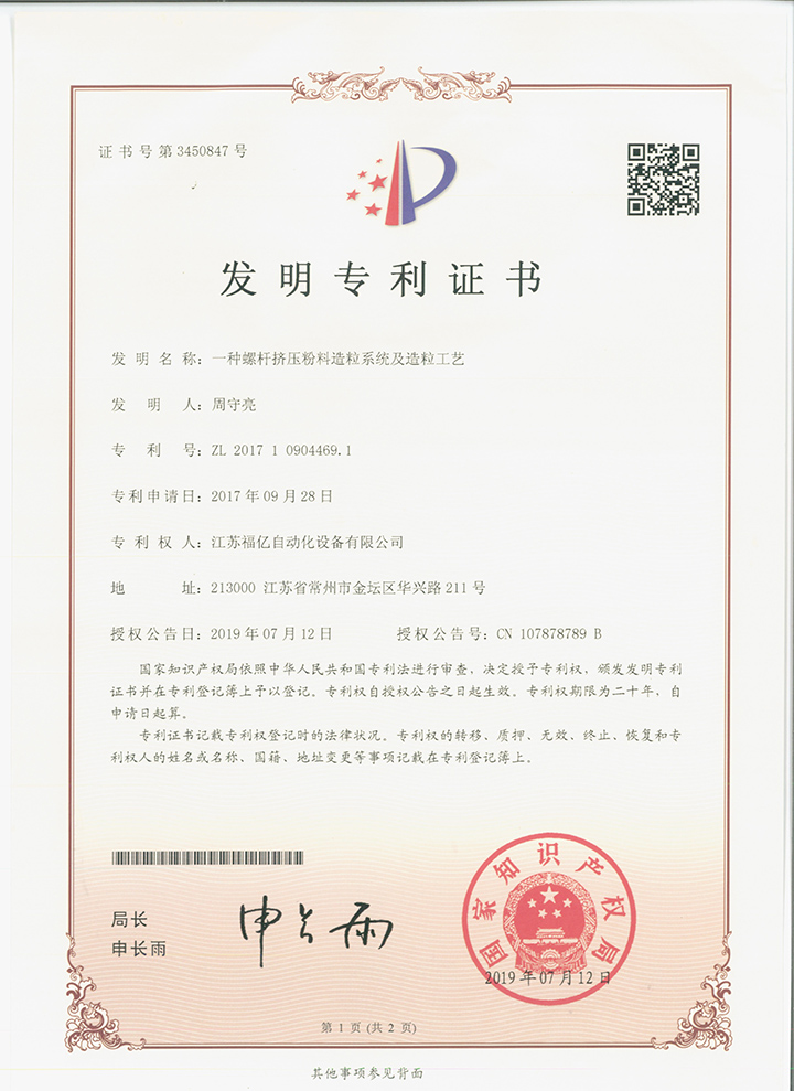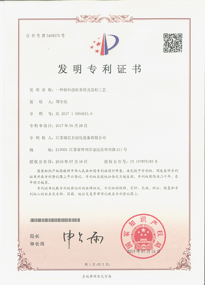 福億造粒  用科技造福億萬客戶專利證書
