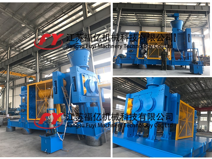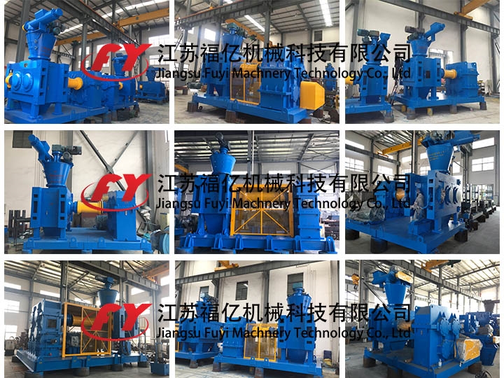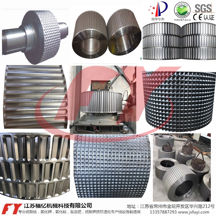 原料經定量加料器均勻送入喂料斗, 扎機利用帶有穴眼孔的成對軋輥,彼此留有一定間隙,兩者以相同的轉速作反向旋轉。其中一組軋輥軸承座在機架內不動,而另一組軋輥軸承座則在機架導軌上游動,借助液壓缸施壓使彼此緊靠。軋輥表面上有規則地排列許多形狀、大小相同的穴眼孔,且波谷對準波谷。而此時干粉狀物料從兩軋輥上方連續均勻地靠自重及強制喂料進入兩軋輥之間,物料先作自由流動,進入咬入區后被軋輥逐漸咬入波谷。隨著軋輥的連續旋轉,物料占有的空間逐漸減少而被逐步壓縮,并達到成型壓力^大值。隨后則壓力逐漸降低,所壓得之型塊因彈性回復加之自重而脫落穴眼孔而進入碎整粒、篩分裝置,所得成品為粒狀合格產品,進行過秤包裝。而粉料口出來的細粉料和不合格的超大顆粒則由返料絞龍重新進入提升機加料口隨同新鮮物料混合加入預加料斗而進入下一輪工藝流程。