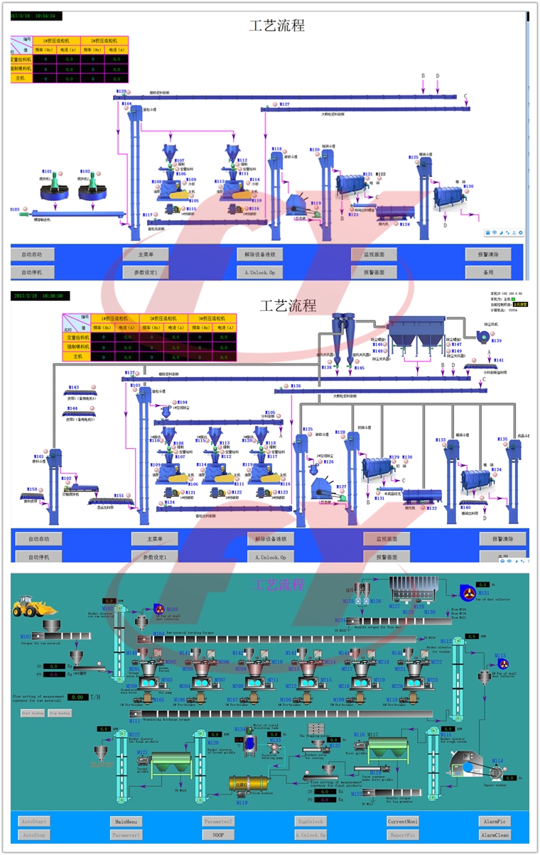 上述的流程大體上就是顆粒硫酸鉀肥的一套全自動生產線了,這一套生產線的控制系統完全是集成在一起的,由中央控制室里的總控系統統一操作和控制,控制系統由可編程控制器(PLC)進行全程控制,配有上位機作為人機交換的載體,同時必要的工序環節配有變頻器進行動態調節,^終使得整條生產線能夠獲得^佳的生產效率;