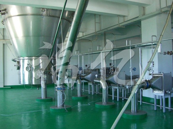 該生產(chǎn)線由供料系統(tǒng)、介質(zhì)循環(huán)系統(tǒng)、空氣加熱凈化系統(tǒng)、干燥塔系統(tǒng)、收料系統(tǒng)、控制系統(tǒng)等多個系統(tǒng)整合而成。主塔系統(tǒng)集中了目前噴霧干燥工程的所有^技術(shù),噴干機組的收料系統(tǒng)由一級旋風(fēng)分離器+布袋除塵器組合形成。一級旋風(fēng)采用高氣量高效率旋風(fēng)進行收集,其收粉率能達到96%左右分,而布袋除塵器是針對蛋白粉類除塵專門設(shè)計的優(yōu)化設(shè)備,能使物料與風(fēng)進行完全分離并沉降,布袋為拒水防油防靜電布袋,過濾目數(shù)可達500目以上。